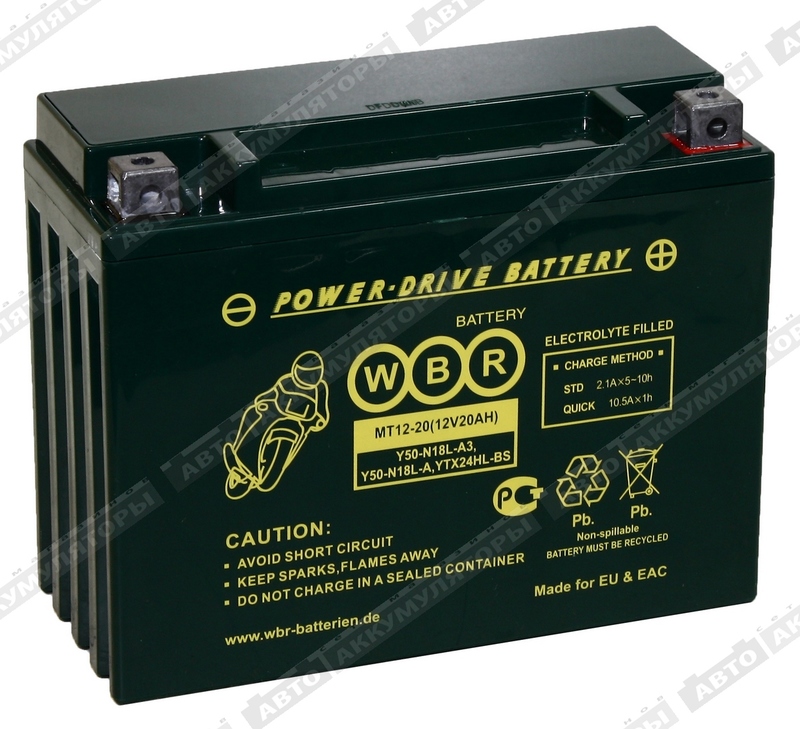 Аккумулятор WBR МТ12-20 - герметизированная, выполненная по технологии AGM, необслуживаемая (MF) стартерная мотоциклетная свинцово-кислотная аккумуляторная батарея. Обладает высоким качеством и надежностью. Она предназначена для запуска двигателя мотоциклов, скутеров, гидроциклов, квадроциклов, снегоходов и мотовездеходов. Батарея соответствует техническим характеристикам и является аналогом мотоциклетных аккумуляторных батарей YUASA моделей Y50-N18L-A, Y50-N18L-A3, YTX24HL-BS.